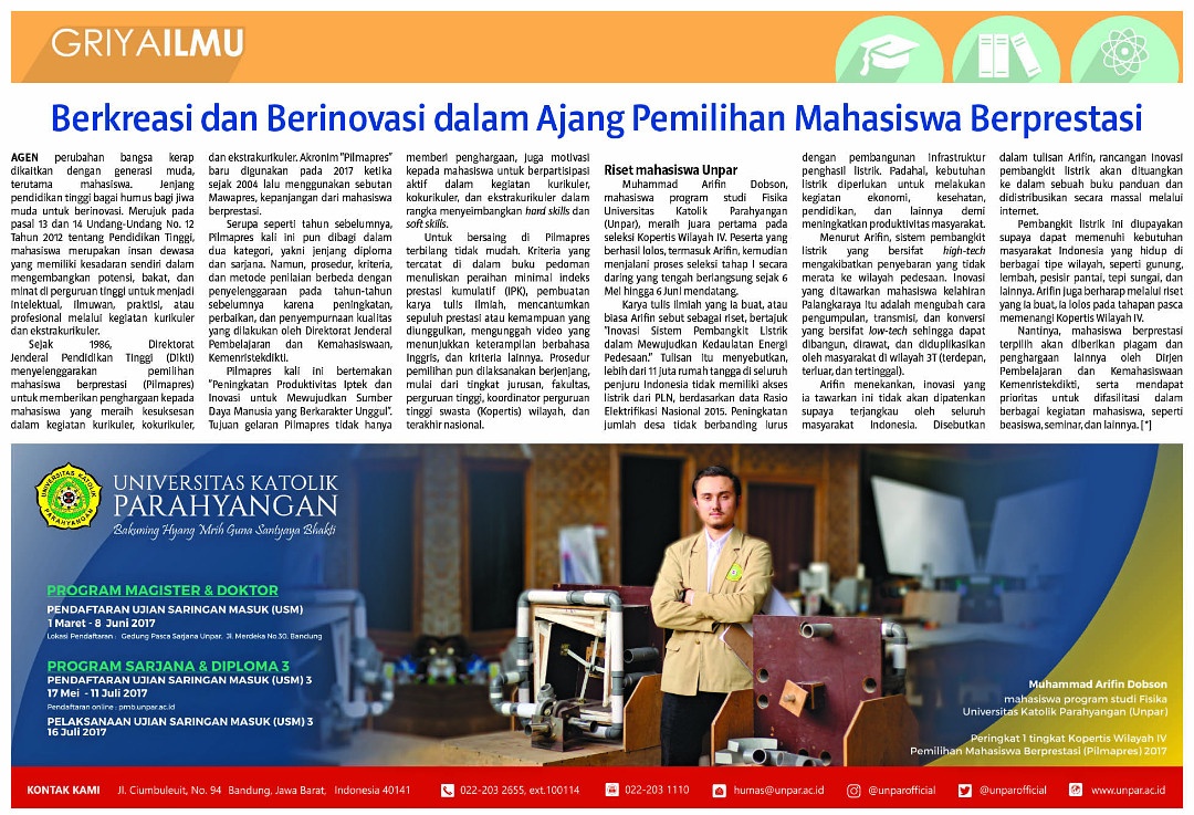 Muhammad Arifin Dobson, mahasiswa program studi Fisika Universitas Katolik Parahyangan (Unpar), meraih juara pertama pada seleksi Kopertis Wilayah IV. Peserta yang berhasil lolos, termasuk Arifin, kemudian menjalani proses seleksi tahap I secara daring yang tengah berlangsung sejak 6 Mei hingga 6 Juni mendatang.