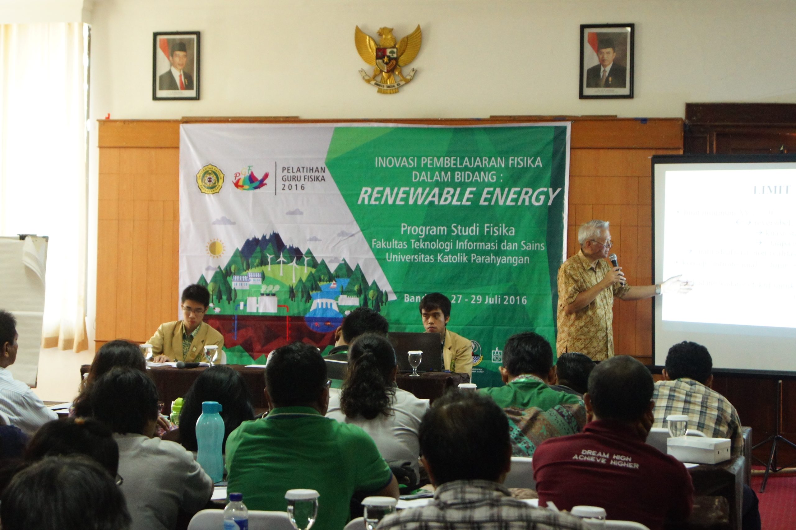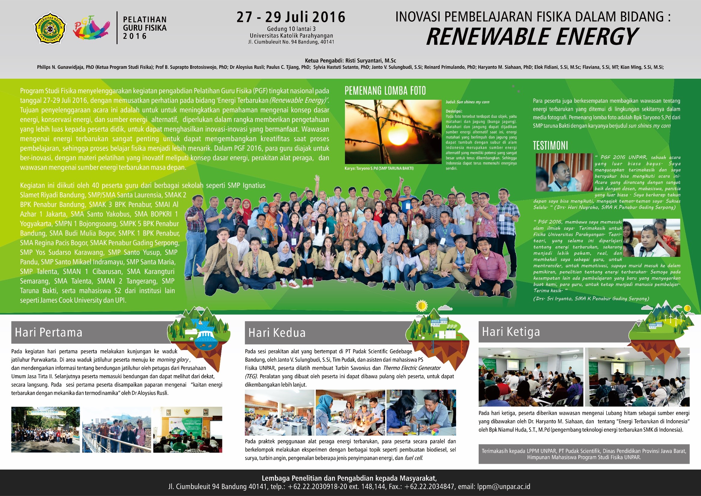 Program Studi Fisika menyelenggarakan kegiatan pengabdian Pelatihan Guru Fisika (PGF) tingkat nasional pada tanggal 27-29 Juli 2016, dengan memusatkan perhatian pada bidang ‘Energi Terbarukan (Renewable Energy)’. Kegiatan ini diikuti oleh 40 peserta guru dari berbagai sekolah seperti SMP Ignatius Slamet Riyadi Bandung, SMP/SMA Santa Laurensia, SMAK 2 BPK Penabur Bandung, SMAK 3 BPK Penabur, SMAI Al Azhar 1 Jakarta, SMA Santo Yakobus, SMA BOPKRI 1 Yogyakarta, SMPN 1 Bojongsoang, SMPK 5 BPK Penabur Bandung, SMA Budi Mulia Bogor, SMPK 1 BPK Penabur, SMA Regina Pacis Bogor, SMAK Penabur Gading Serpong, SMP Yos Sudarso Karawang, SMP Santo Yusup, SMP Pandu, SMP Santo Mikael Indramayu, SMP Santa Maria, SMP Talenta, SMAN 1 Cibarusan, SMA Karangturi Semarang, SMA Talenta, SMAN 2 Tangerang, SMP Taruna Bakti, serta mahasiswa S2 dari institusi lain seperti James Cook University dan UPI.