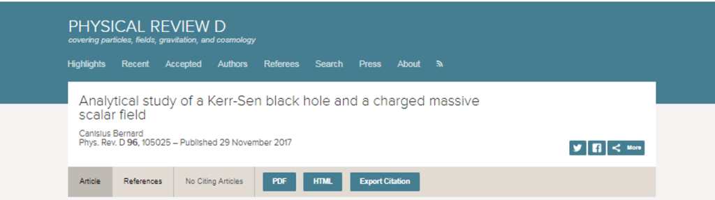 Setelah pada tahun 2016, Canisius Bernard yang pada saat itu tercatat sebagai mahasiswa Program Studi Fisika UNPAR berhasil menorehkan prestasi akademik yang mengagumkan, yakni dengan menghasilkan publikasi single author di sebuah jurnal internasional yang berjudul “Stationary charged scalar clouds around black holes in string theory” di sebuah jurnal internasional Physical Review D (https://journals.aps.org/prd/abstract/10.1103/PhysRevD.94.085007), tahun 2017 Bernard kembali berhasil mempublikasikan karya keduanya yang berjudul: “Analytical study of a Kerr-Sen black hole and a charged massive scalar field” (https://journals.aps.org/prd/abstract/10.1103/PhysRevD.96.105025).